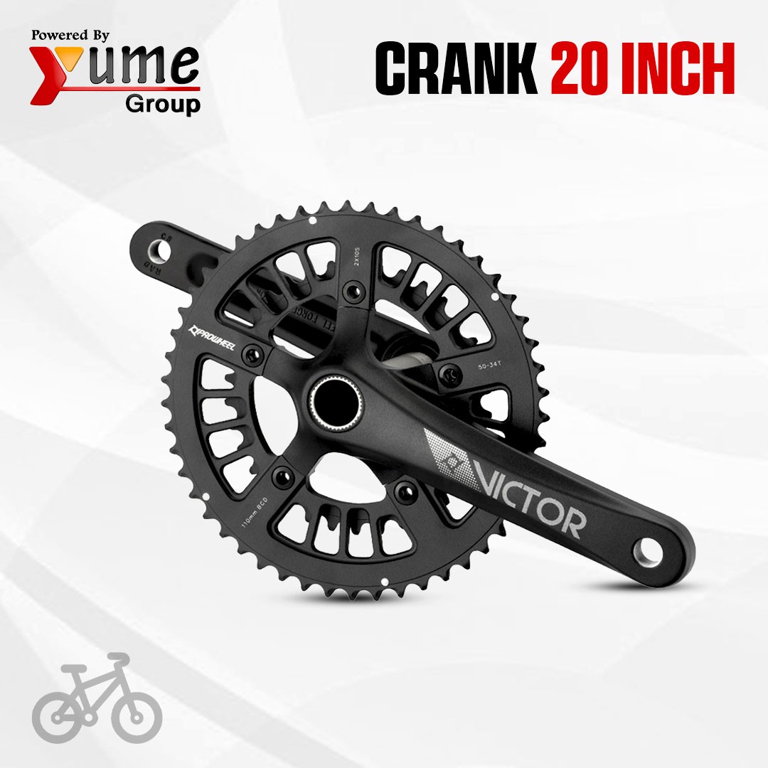 The Yume Group Victor 20-Inch Pro Crankset, powered by Prowheel, is a high-performance drivetrain component designed specifically for road and folding bicycles. This premium crankset features a 2x10-speed double chainring configuration with a versatile 50-34T tooth range, making it perfect for both high-speed sprints on flat roads and efficient climbing on steep inclines. Built with cold-forged AL-6061-T6 aluminum alloy crank arms, it provides an exceptional strength-to-weight ratio and minimal flex under heavy load. The hollow spindle design further reduces overall weight while maintaining structural integrity, and the matte black sand anodized finish offers superior durability against scratches and corrosion.