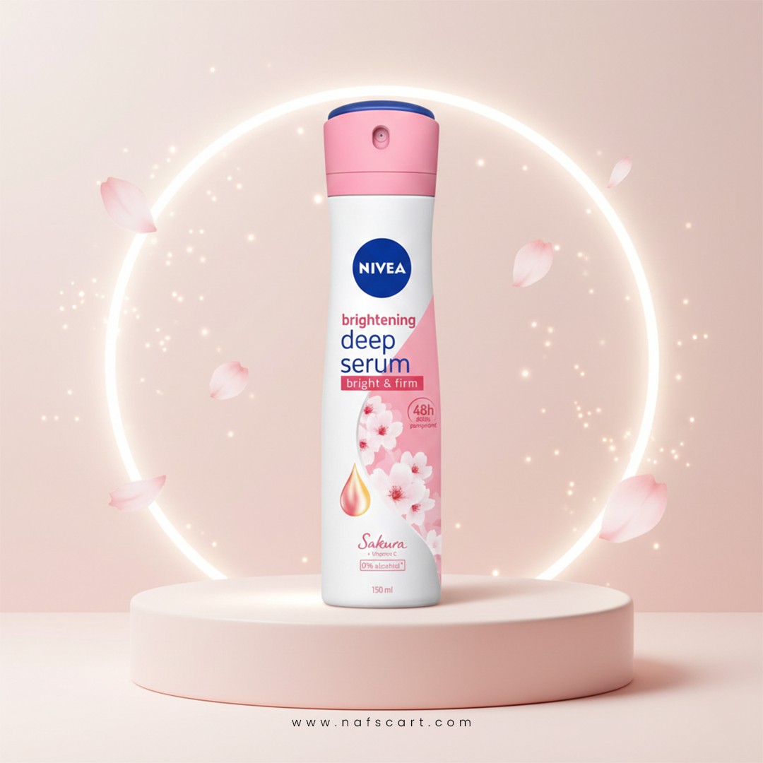 NIVEA Brightening Deep Serum Spray Sakura & Vitamin C is a refreshing body serum spray that deeply nourishes skin while delivering visible brightening and firming benefits. Enriched with Sakura extract and Vitamin C, it helps reduce dullness, even skin tone, and restore a healthy radiant glow.