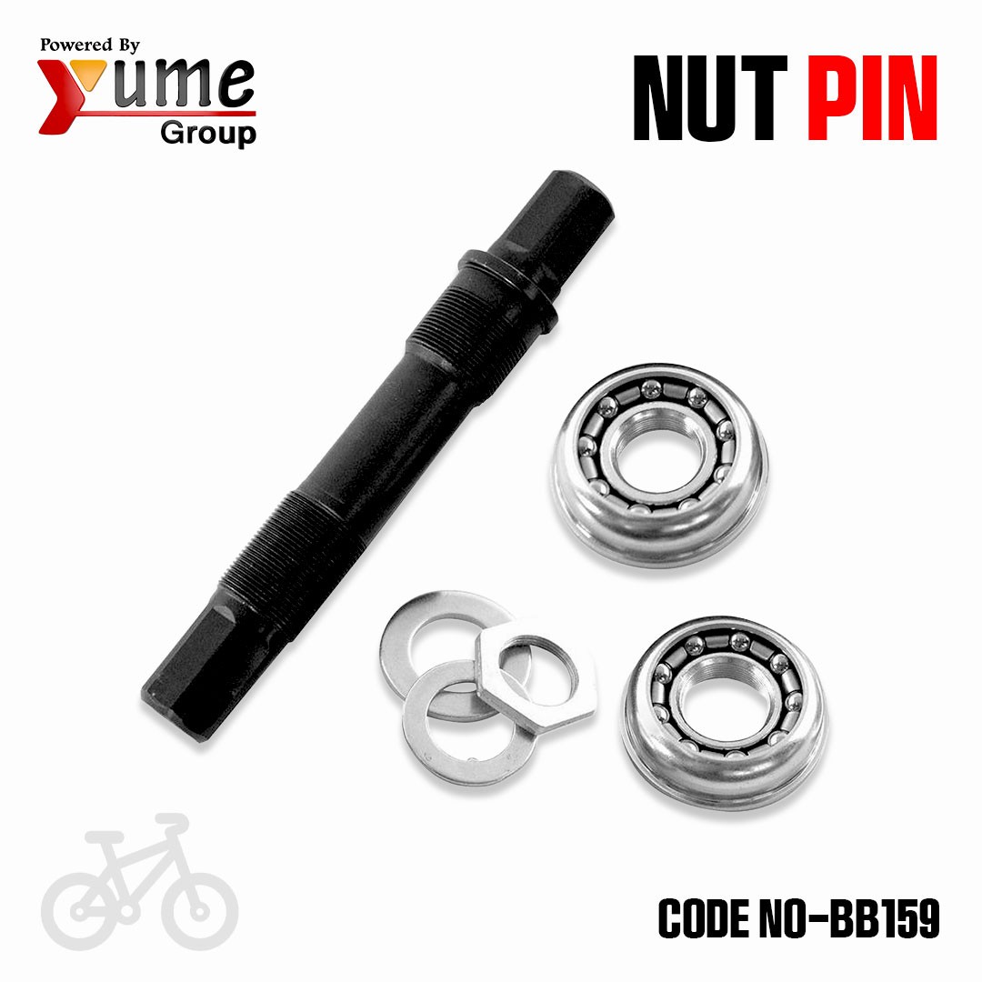 The Yume Nut Pin Set (BB159) is a comprehensive bottom bracket hardware kit designed for traditional bicycle spindle systems. This set includes a high-strength threaded spindle (pin), two ball bearing units housed in durable cups, and the necessary locknuts and washers for a complete installation. Engineered for smooth rotation and long-lasting durability, this kit is ideal for repairing or upgrading standard bottom bracket assemblies to ensure a stable and efficient drivetrain. The robust construction helps maintain alignment and reduces friction during pedaling.