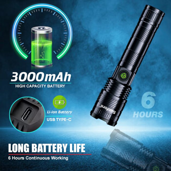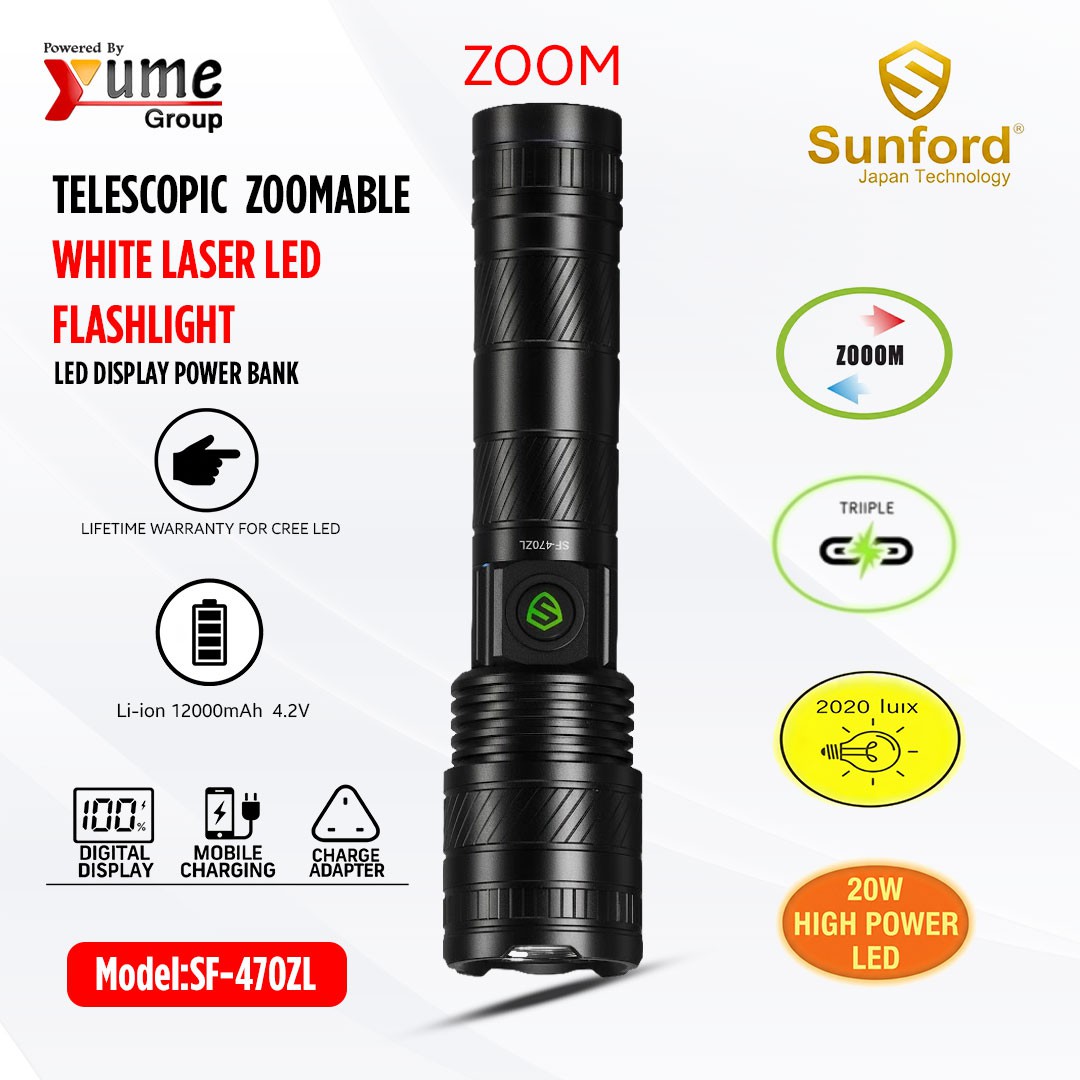 The Sunford SF-470ZL is a high-powered lighting and charging solution designed with advanced Japan Technology. This multifunctional device features a 20W high-power white laser LED that delivers up to 2000 lumens of brightness and an impressive beam distance reaching up to 2000 meters. Its telescopic zoom system allows for seamless adjustment between a broad floodlight and a focused spotlight.
