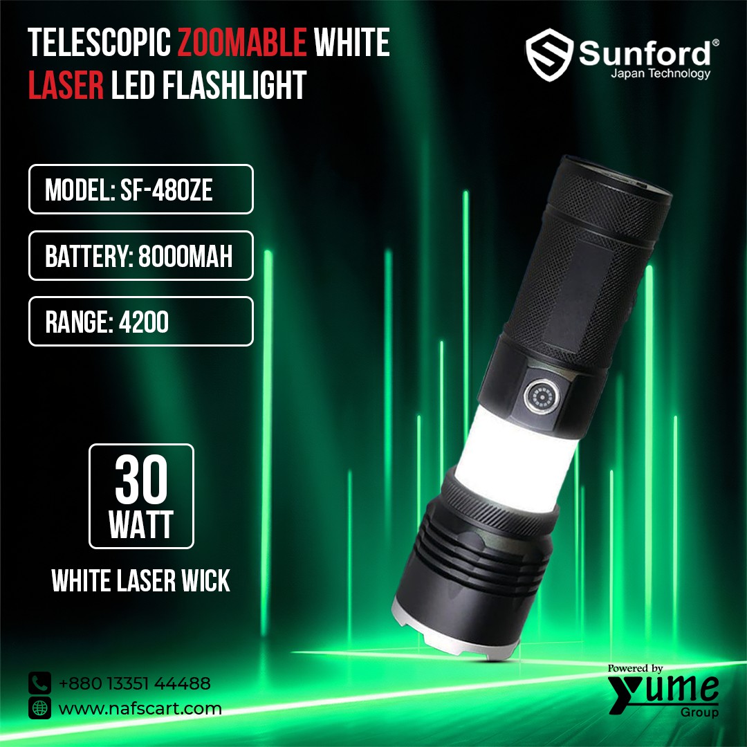 Sunford SF-480ZE 30W Telescopic Zoomable White Laser LED Flashlight – 4200m Range with 8000mAh Battery