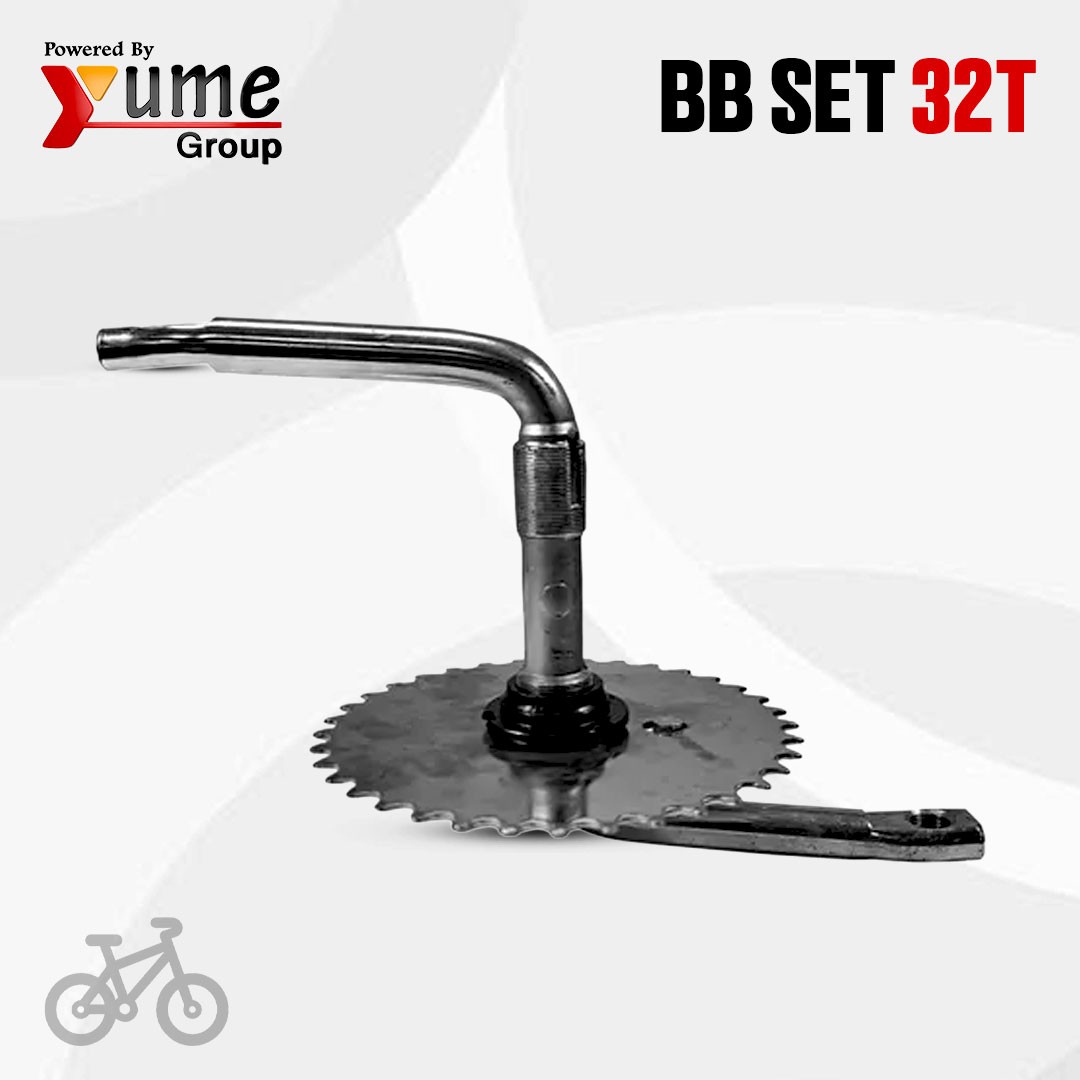 The Yume BB Set 32T is a complete drivetrain solution featuring a high-strength single-speed crankset and a compatible bottom bracket assembly. Designed primarily for mountain bikes (MTB), folding bikes, and fixed-gear bicycles, this set provides a balanced 32-tooth (32T) chainring that offers an ideal compromise between climbing power and flat-road speed. The crank arms are manufactured from forged aluminum alloy to ensure maximum rigidity and power transfer while remaining lightweight. This kit includes a precision-engineered bottom bracket with sealed bearings that protect against dust and moisture, ensuring smooth, consistent rotation for a more efficient ride. Whether you are converting to a 1x (single chainring) setup or replacing a worn-out component, the BB Set 32T delivers reliable performance across various terrains.